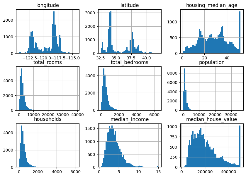 housing . hist ( bins = 50 , figsize = ( 10 , 7 ))