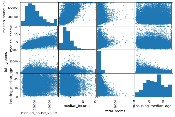 scatter_matrix(housing[attributes], figsize=(8, 5))