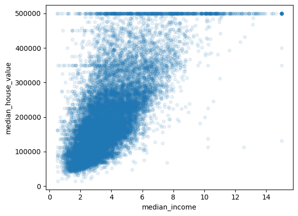 housing.plot(kind="scatter", x="median_income", y="median_house_value", alpha=0.1)