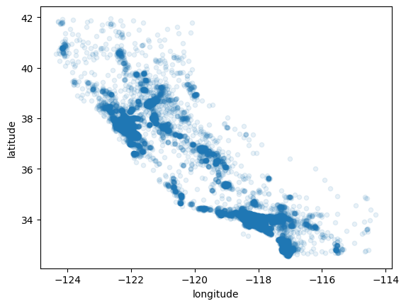 housing.plot(kind="scatter", x="longitude", y="latitude", alpha=0.1)