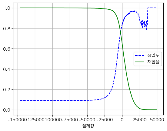 # 임계값에 대한 정밀도와 재현율 그래프 그리기