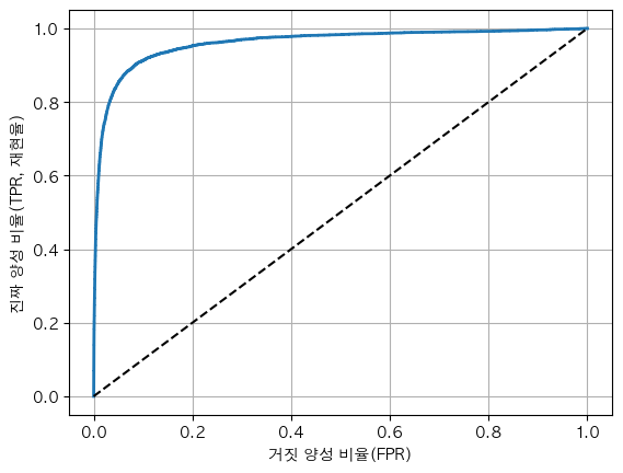 - 거짓 양성 비율(FPR) 대비 진짜 양성 비율(TPR = 재현율)을 보는 곡선