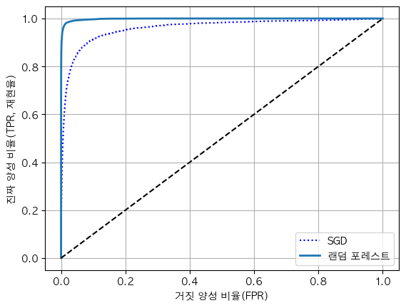- 랜덤포레스트의 ROC곡선이 왼쪽 위 모서리에 훨씬 가깝다 = 거짓 양성 비율을 낮게 유지하면서 재현율을 훨씬 더 높게 올릴 수 있다